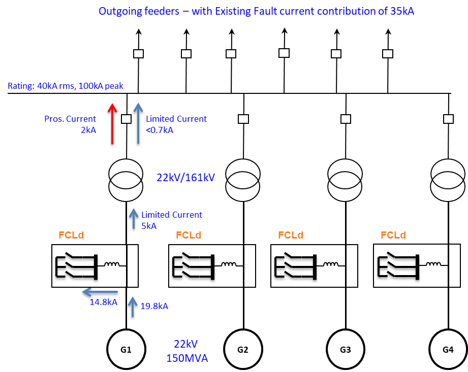 Using FCLd devices to limit fault current contribution into a fault constrained 161kV network (with 35kA existing fault level). Adding 4 new generators – raises fault level to 43kA – above the allowed 40kA. An FCLd added to each generator reduces fault current to less than 38kA on 161kV bus. Higher power generators (hundreds of MVAs) can be accommodated by using parallel FCLd devices. Such parallel arrangement allows for flexible and remotely managed limitation of fault current.